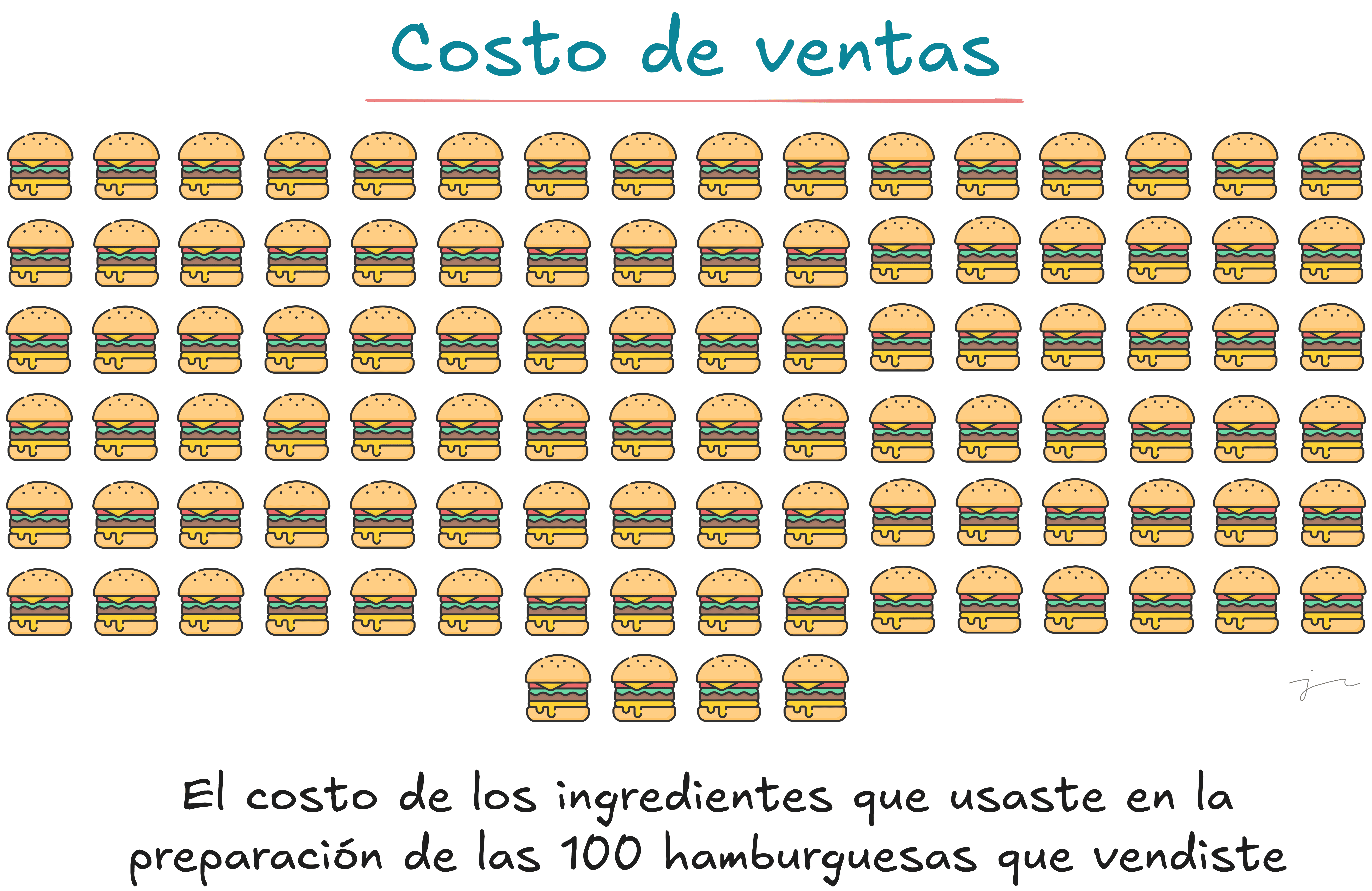 El costo de ventas es todo lo que utilizaste para vender tu producto o servicio. Supongamos que tienes un negocio de hamburguesas y que el mes anterior vendiste 100 hamburguesas.